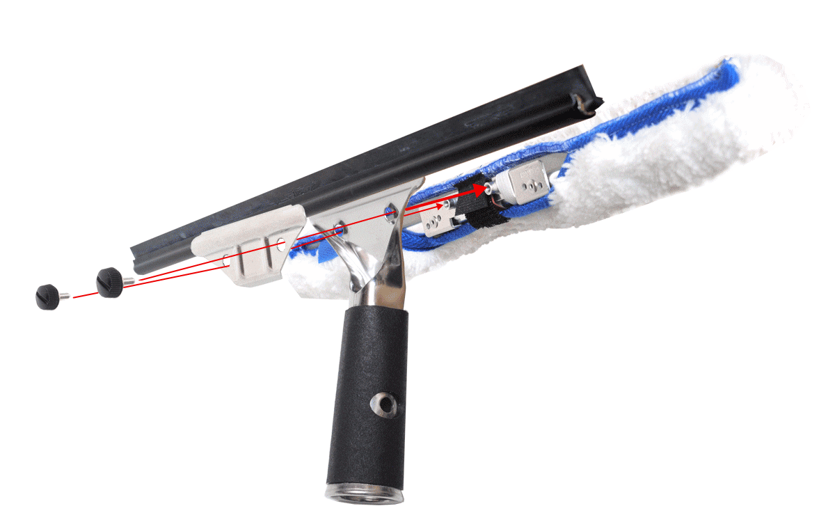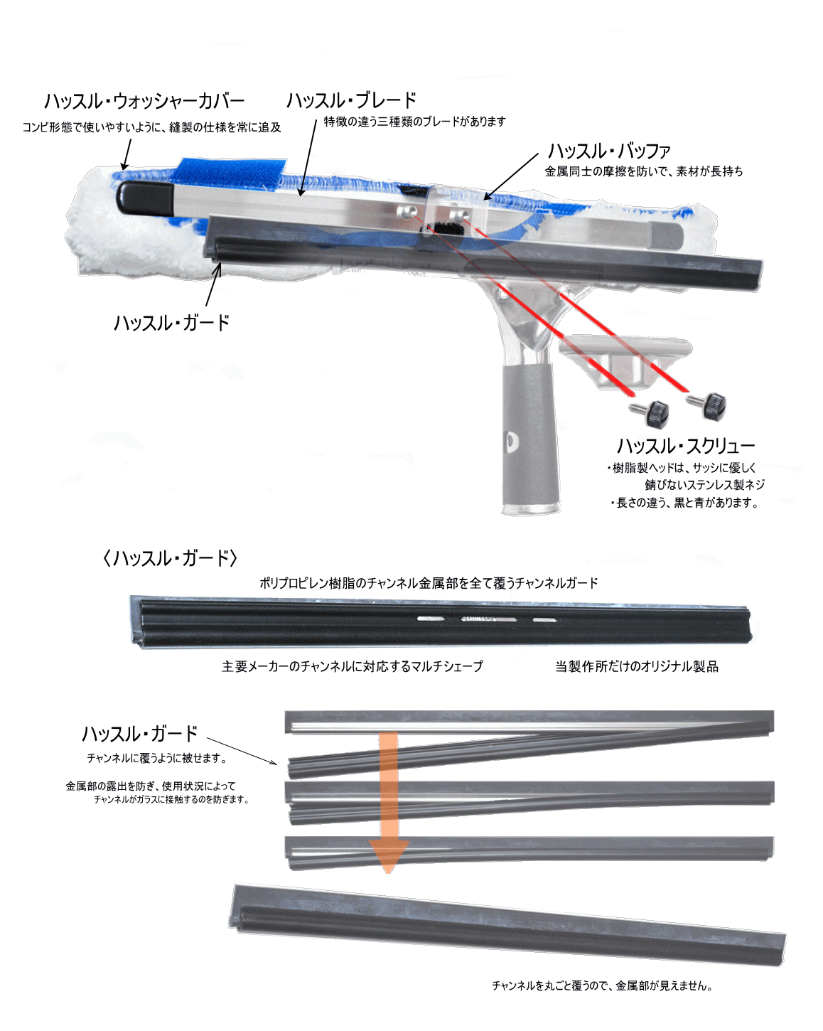 ハッスルズ・構成パーツにあります「ハッスルガード」 「ハッスル・スクリュー」は、ガラス及びサッシに傷をつけないように配慮した製品です。本来、水を切る目的のスクイジーに洗うという別目的のウォッシャーを取り付けて使用しますため、洗いの際、使用しないチャンネル部分の金属側をガラスに向けての操作となります。 洗いの際は、洗うこととは関係ない金属部分は意識の外にあるため、操作を誤るとガラスを傷つけてしまう恐れがあり非常に危険です。「ハッスルガード」は、チャンネルの金属部分をポリプロピレン素材で覆い隠すことで、その危険性をなくそうという製品となります。ハッスルスクリューはネジの頭部が樹脂ですので、やはり、サッシなどの金属に対して傷をつける恐れがなく採用しております。
