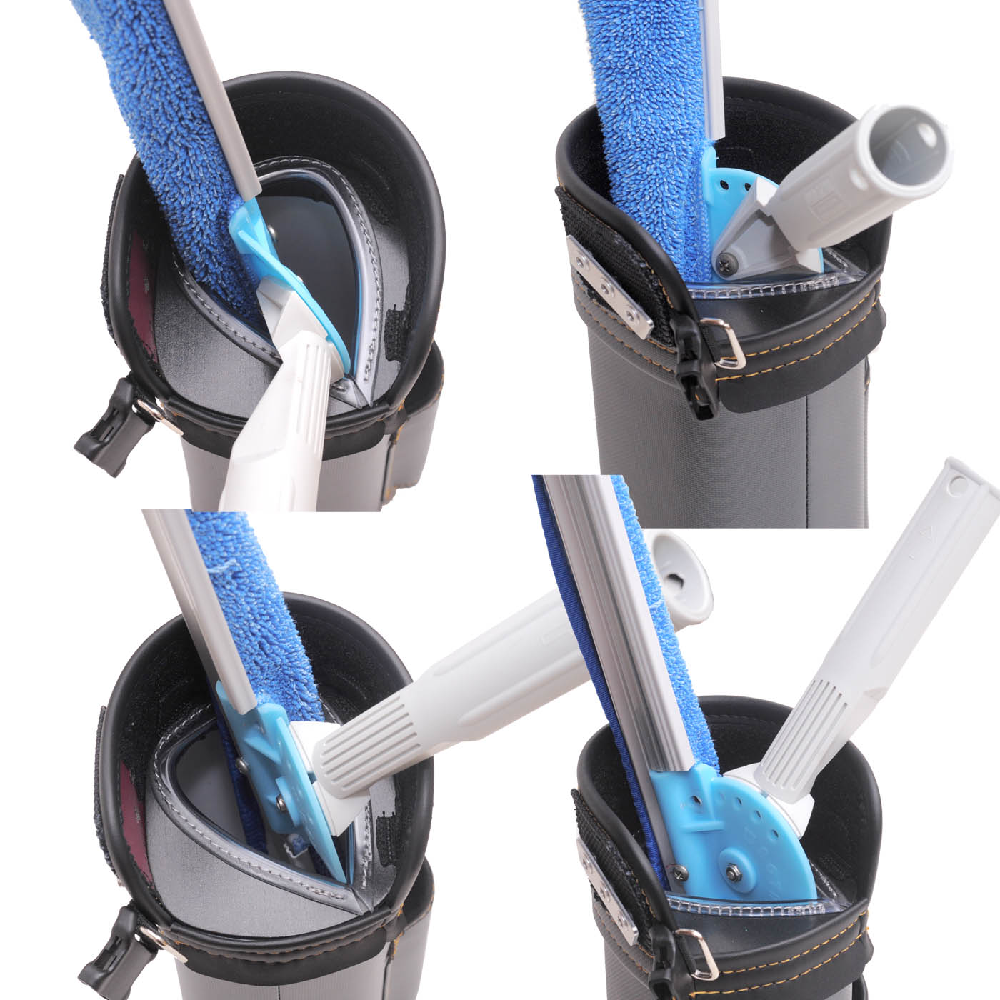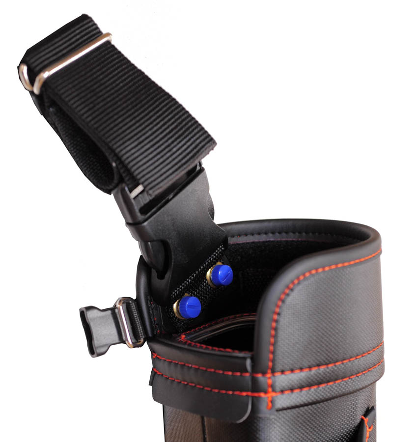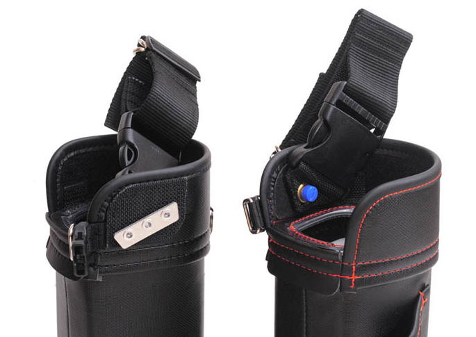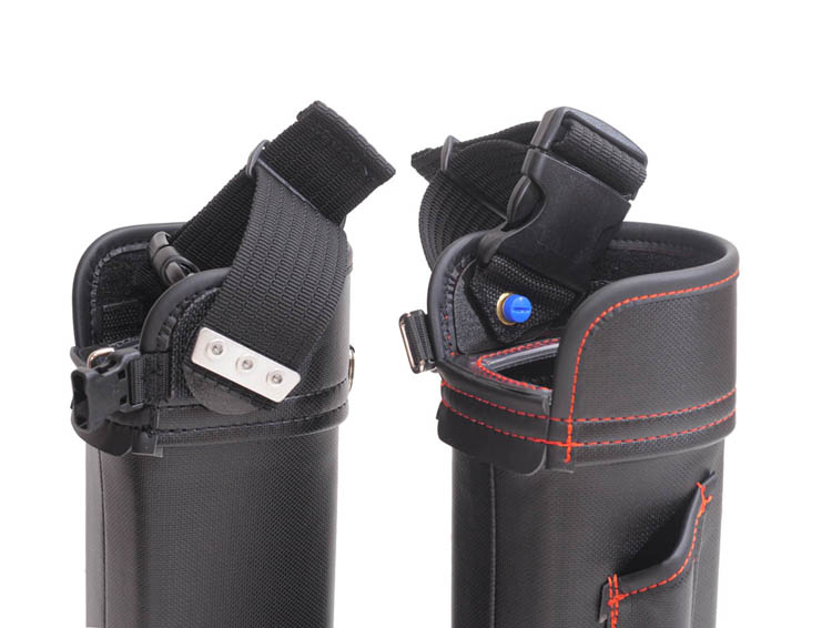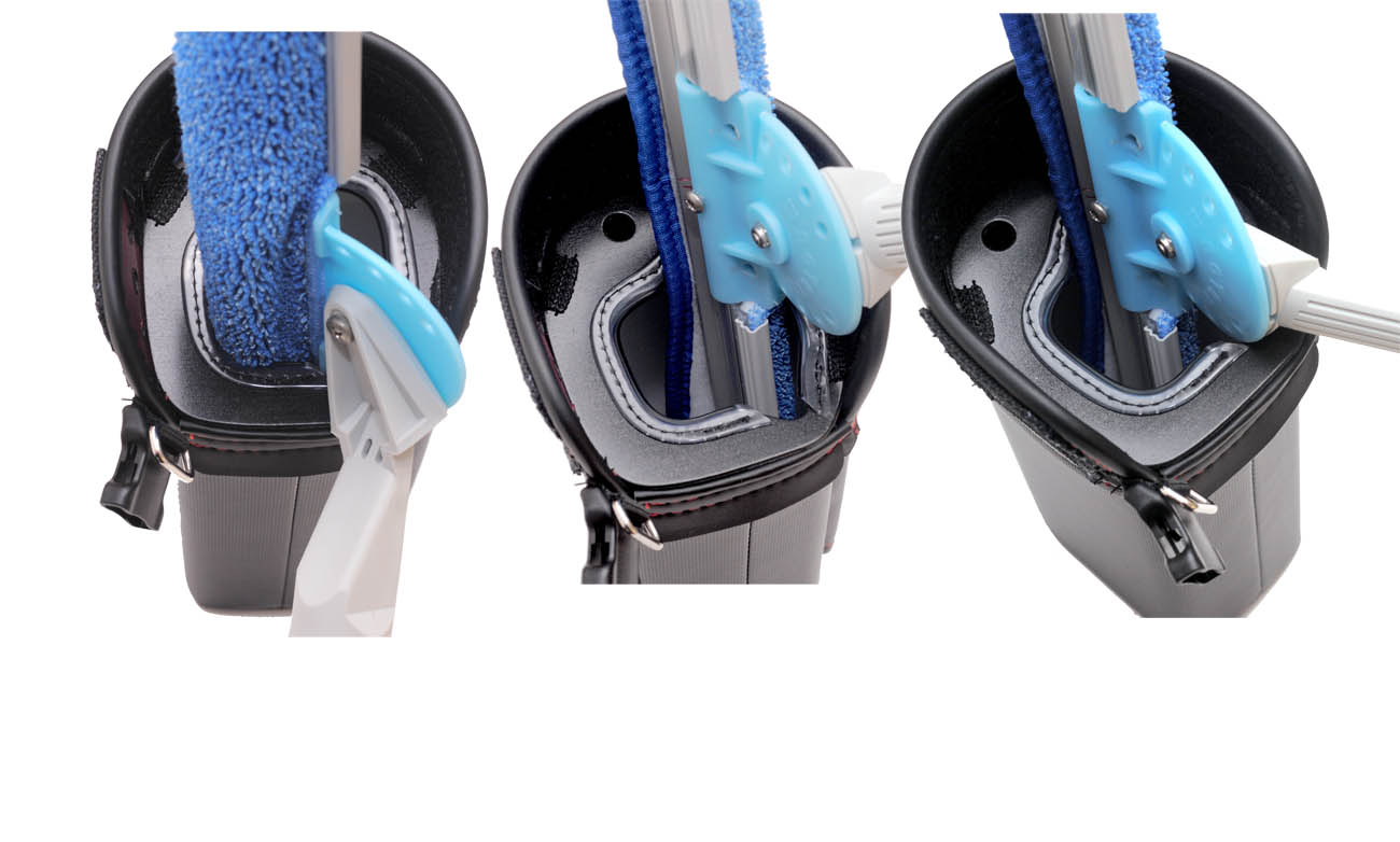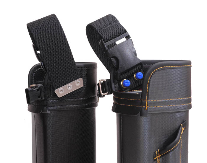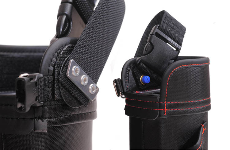 この製品は、前々から要望のありました、弊所製バケットの要望に応え、開発に着手しました。わかりやすい大容量、しぼり機構の他に、ベルトに吊り下げた時に、前方に傾き加減となるバランス、歩行時のバタつきの軽減、太ももに当たる感じの軽減などにも配慮しました。