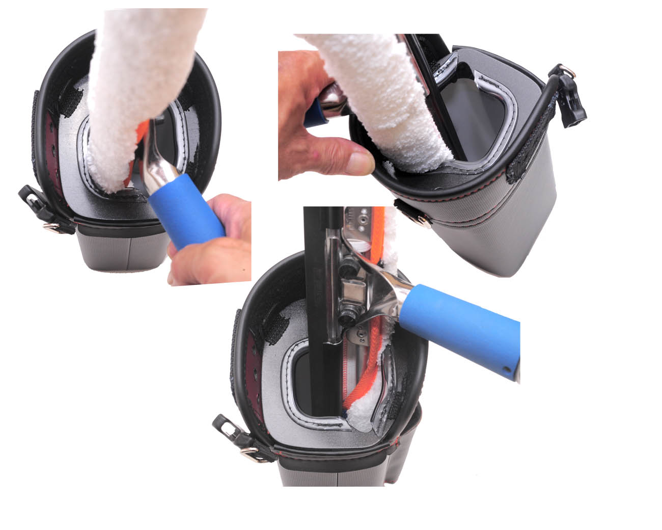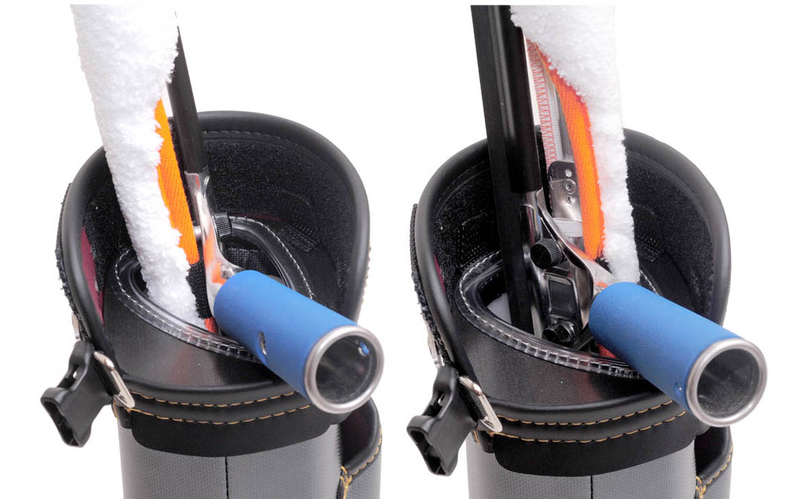お客様からの強い要望によりワグ用のしぼりに取り組みました。ウォッシャーパッドがより濡らせるように、ワグテイルの円盤部分がしぼり通過するような形状にし、なるべくウォッシャーが濡れる面積を増やし、また、ハンドルが暴れないような形状にしました。前側の2か所のコーナー及び手前バックル側の面でウォッシャーをしぼるような感じになります。ハッスルズ・通常のTバーウォッシャーも使用可能です。