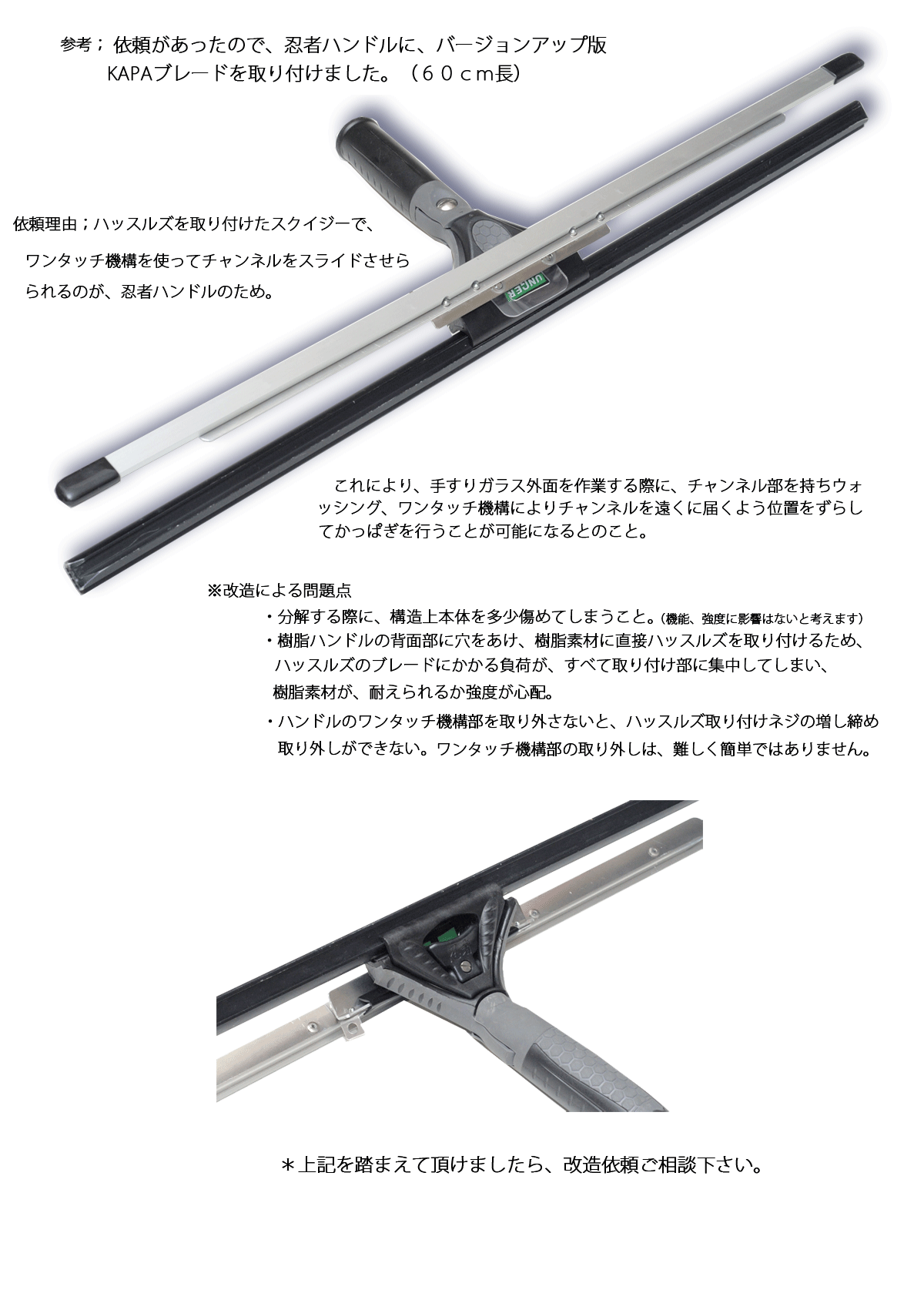 ・コの字型の部材を組み合わせることで、ブレードの耐久性と強度アップと平面部分を持つこととなり、明確な面接触可能に。また、支点の後ろ側につばを出すことで、力のモーメントがアップ、厚い生地のウォッシャー使用時にもしっかりと可動します。パンサー10、12が、素材の持つ強度によりしっかりと力を入れたウォッシングが特徴なのに対し、KAPAブレードは、ウォッシャーの接触面積の大きさにより、力を入れずとも擦りムラの少ない安定したウォッシングを実現します。