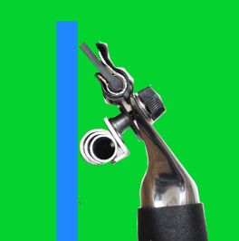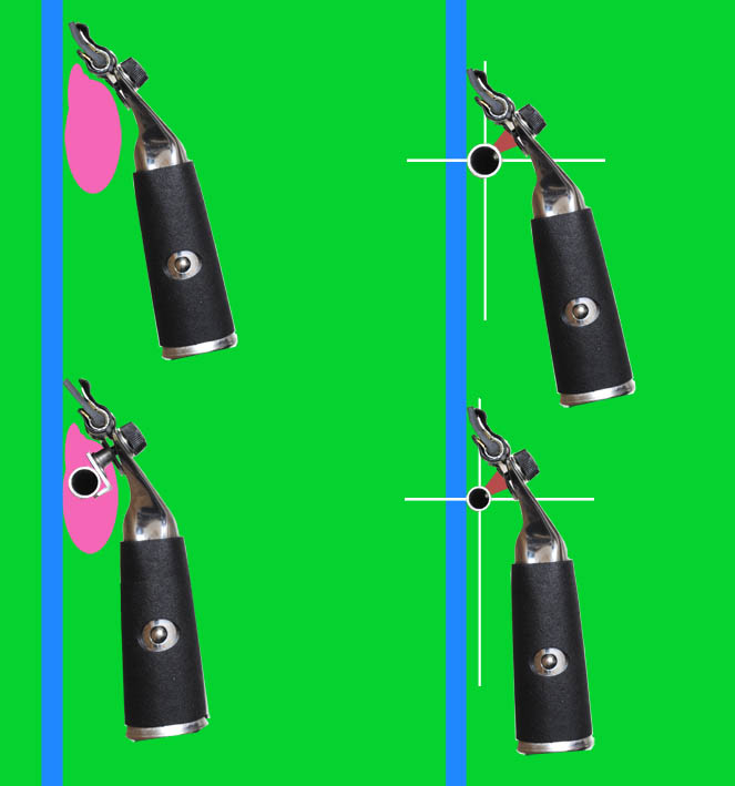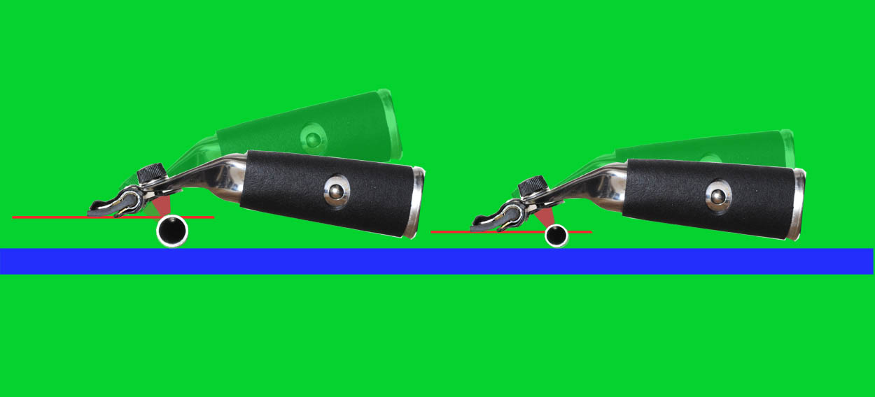 図1の右側は、上がパイプ径の太いもの、下が細いものとなります。ハンドル持ち手下部が、ガラス(青いライン)からどのくらい離れているかを見ると、上の太いパイプの方が、持ち手部分がガラスから離れています。下のハンドルでは、ハンドルの持ち手部分はガラスに近づいています。