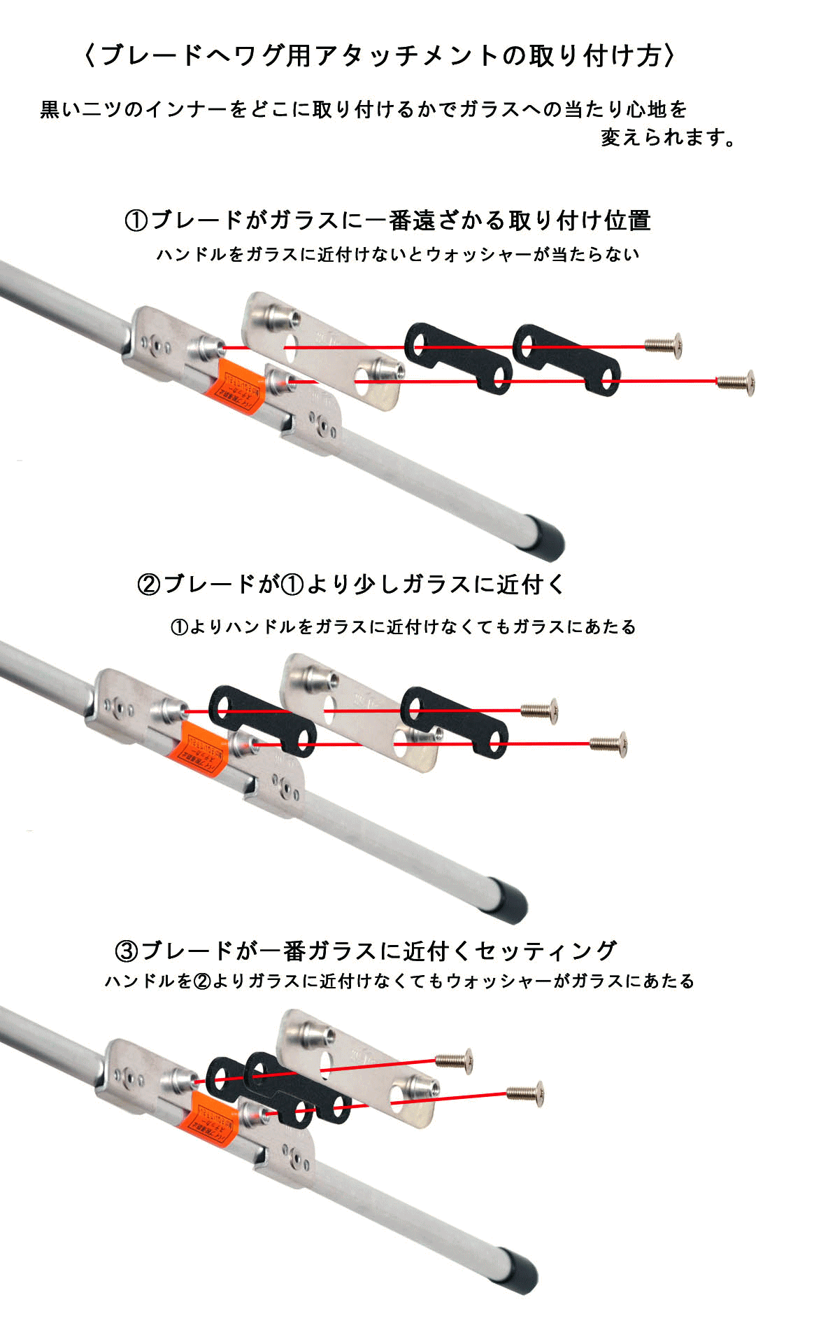 しかしながら、ハッスルズのすべてのブレードは、スパイラルポジション基準の長さとなるためワグのような独特の動きの場合では、サッシ際でブレードがゴムより先により当たってしまうため操作性が良いとは言い難いものがあります。このことを解消するため、今までよりブレードの幅を狭めたハッスルズNパンサーのご使用をお勧めします。